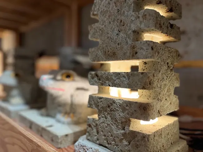 石材事業では、自社保有の採掘場にて大谷石の採掘・加工を行い、住宅や店舗の内外装工事、公共施設の施工など、幅広い分野に供給しています。 長年培った技術と経験をもとに、素材の魅力を最大限に引き出す施工を提供しています。また大谷石を用いた内外装材のほか、工芸品や雑貨なども取り扱っており、地域の文化と美しさを伝える商品づくりにも取り組んでいます。